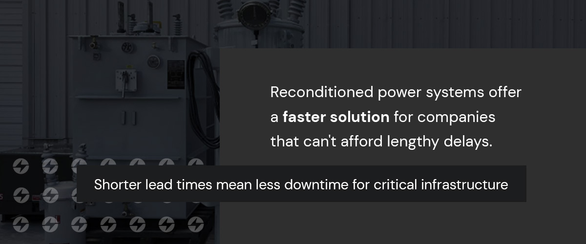 New transformers can take months to manufacture and deliver, especially for custom orders. Reconditioned power systems offer a faster solution for companies that can’t afford lengthy delays. Shorter lead times mean less downtime for critical infrastructure, reducing reliance on temporary, resource-heavy solutions like generators.